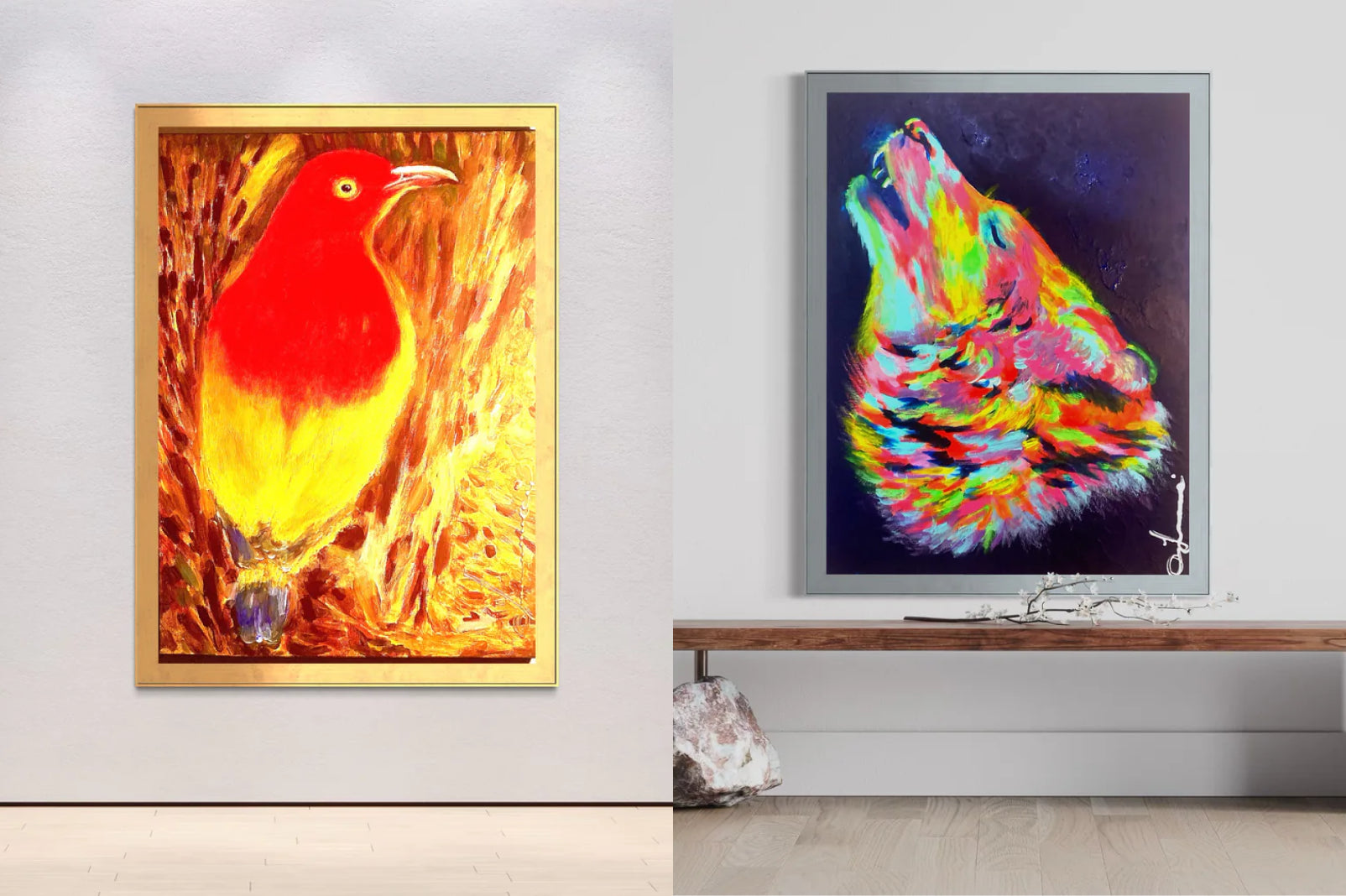 Antonia's flame bowerbird painting, one of the most vivid works of animal art in our collection, enters her chromatic philosophy through one of the rarest animals in the world. The flame bowerbird of New Guinea does not build a nest. It builds a stage, a constructed work of beauty designed purely to be seen. Antonia recognised herself in that: an artist whose creation is in service of something beyond aesthetics.