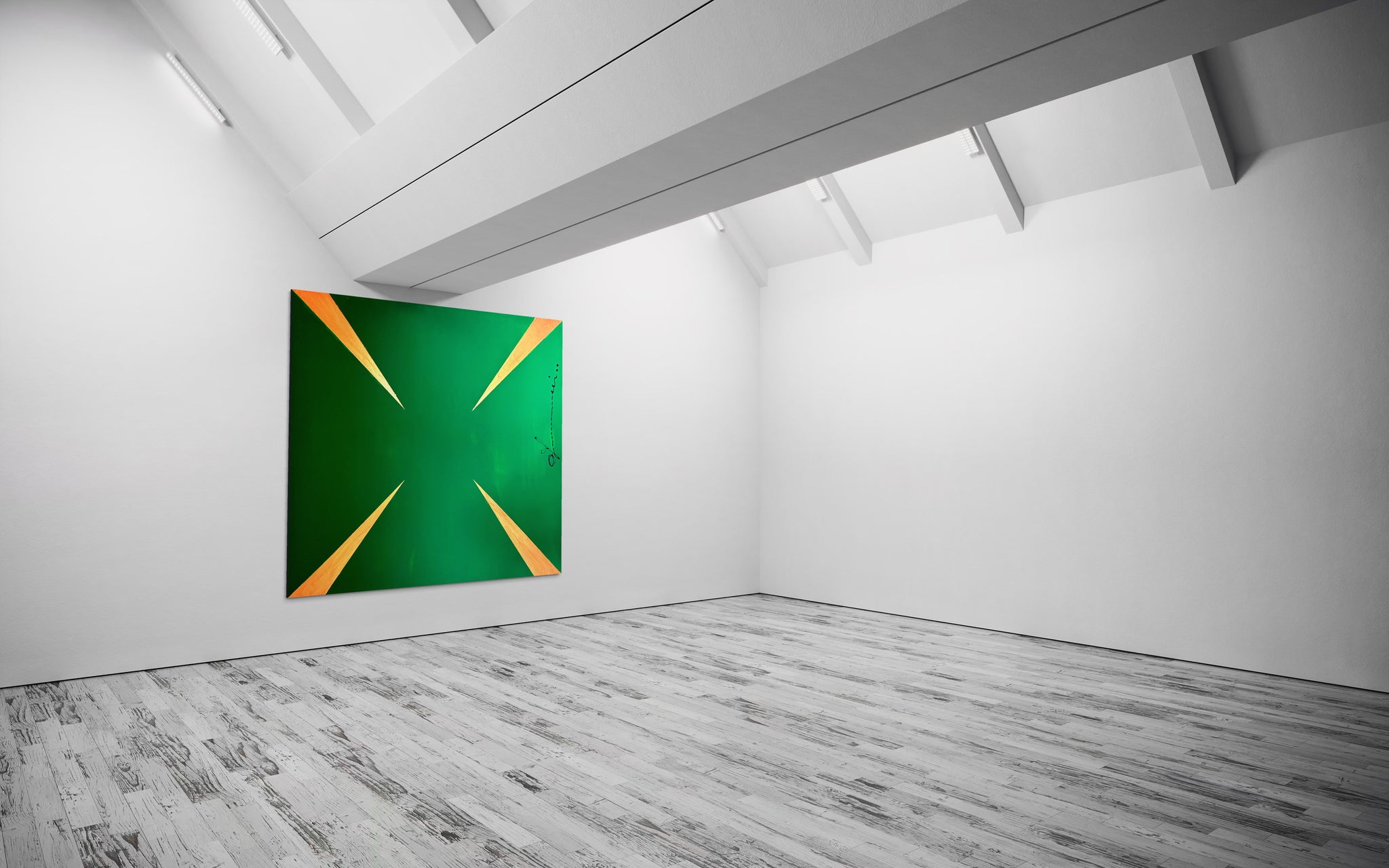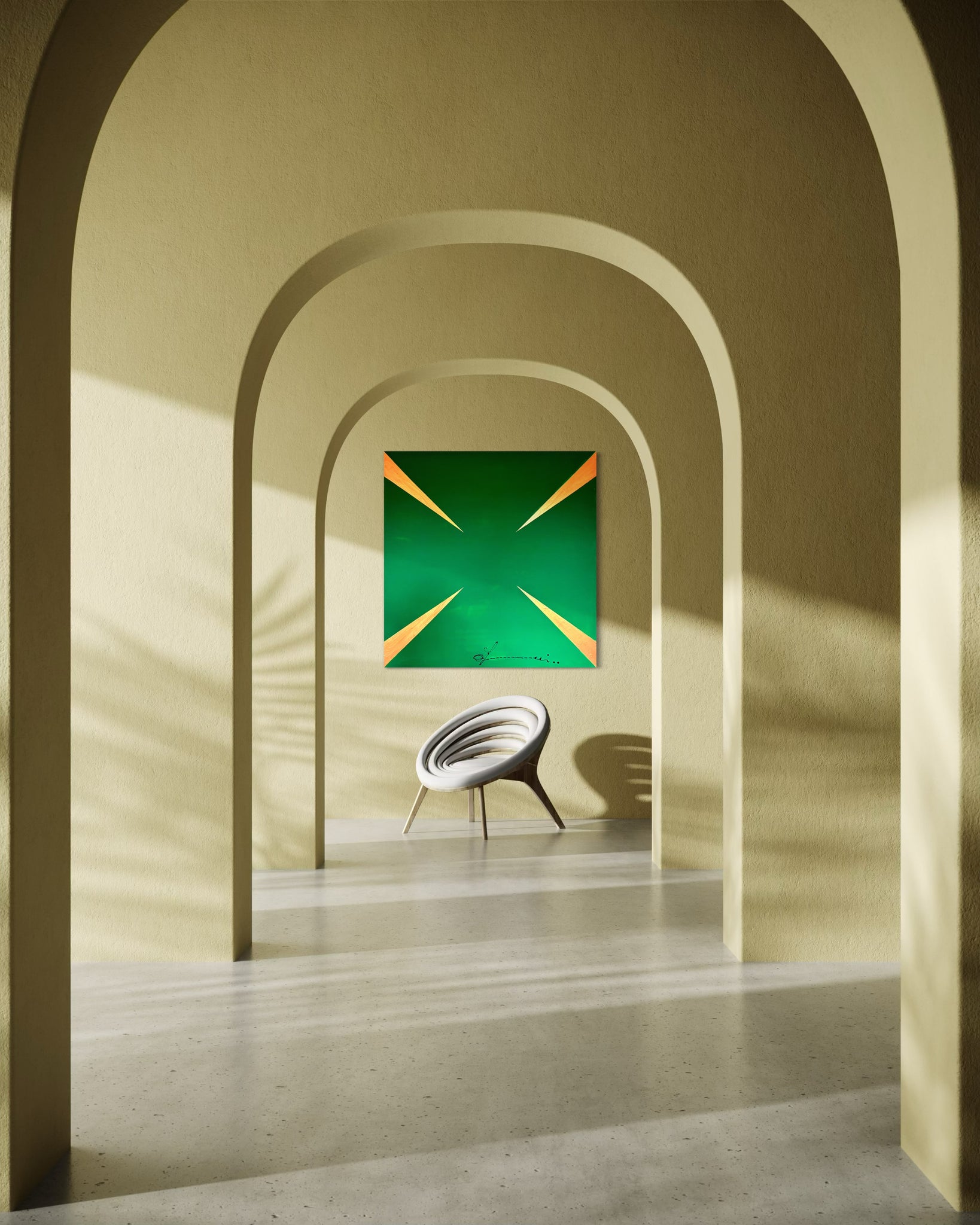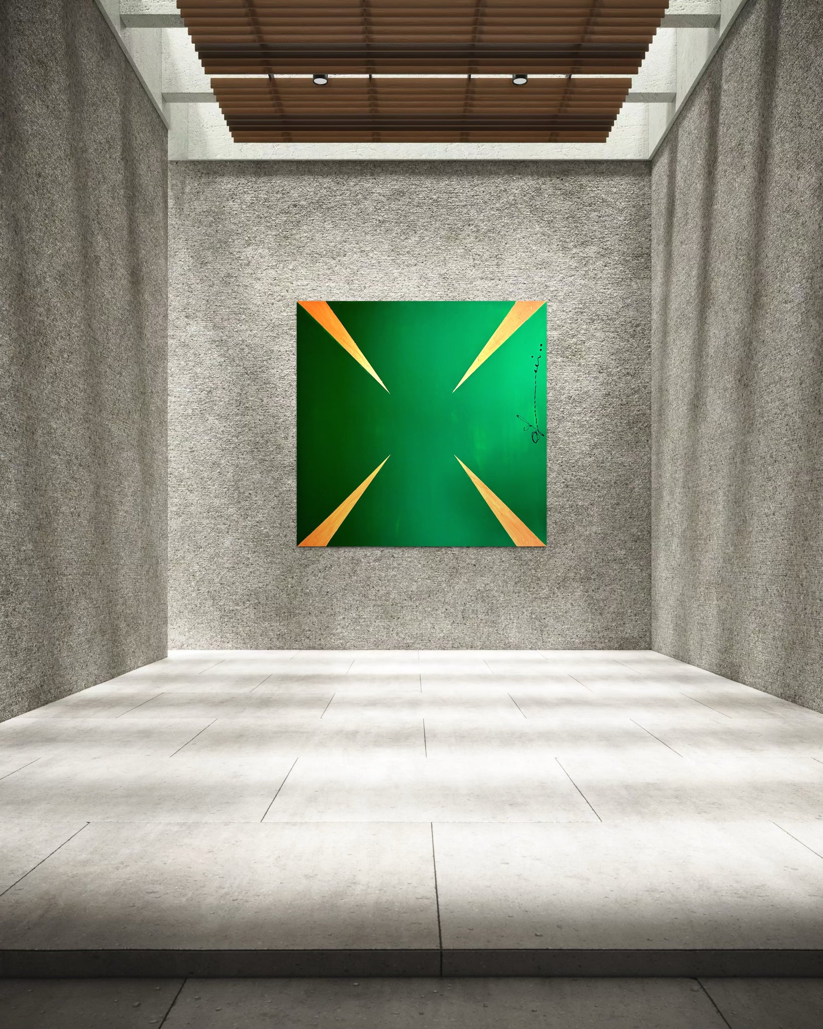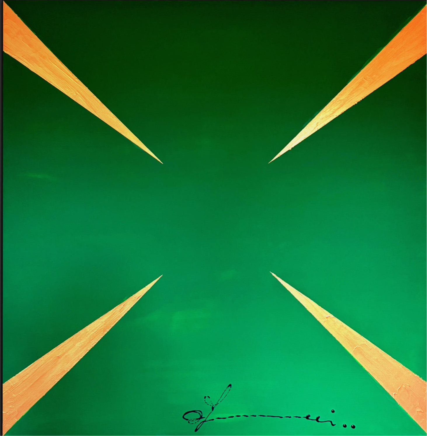 "G Stop" is a striking visual meditation on insatiability. The painting presents a dynamic pattern of sharp, gleaming gold arrows, each one oriented to propel the gaze forward, set against an unbroken background of deep, avaricious green. This composition does more than depict greed; it embodies its very mechanism. The arrows represent the perpetual motion of desire the endless drive to acquire, produce, and consume. There is no terminus, no point of satisfaction in the work; only the relentless suggestion of more. Thus, the painting becomes a powerful symbol of the modern condition, critiquing a cycle where the pursuit of wealth and growth becomes an endless, self perpetuating goal, forever out of reach.