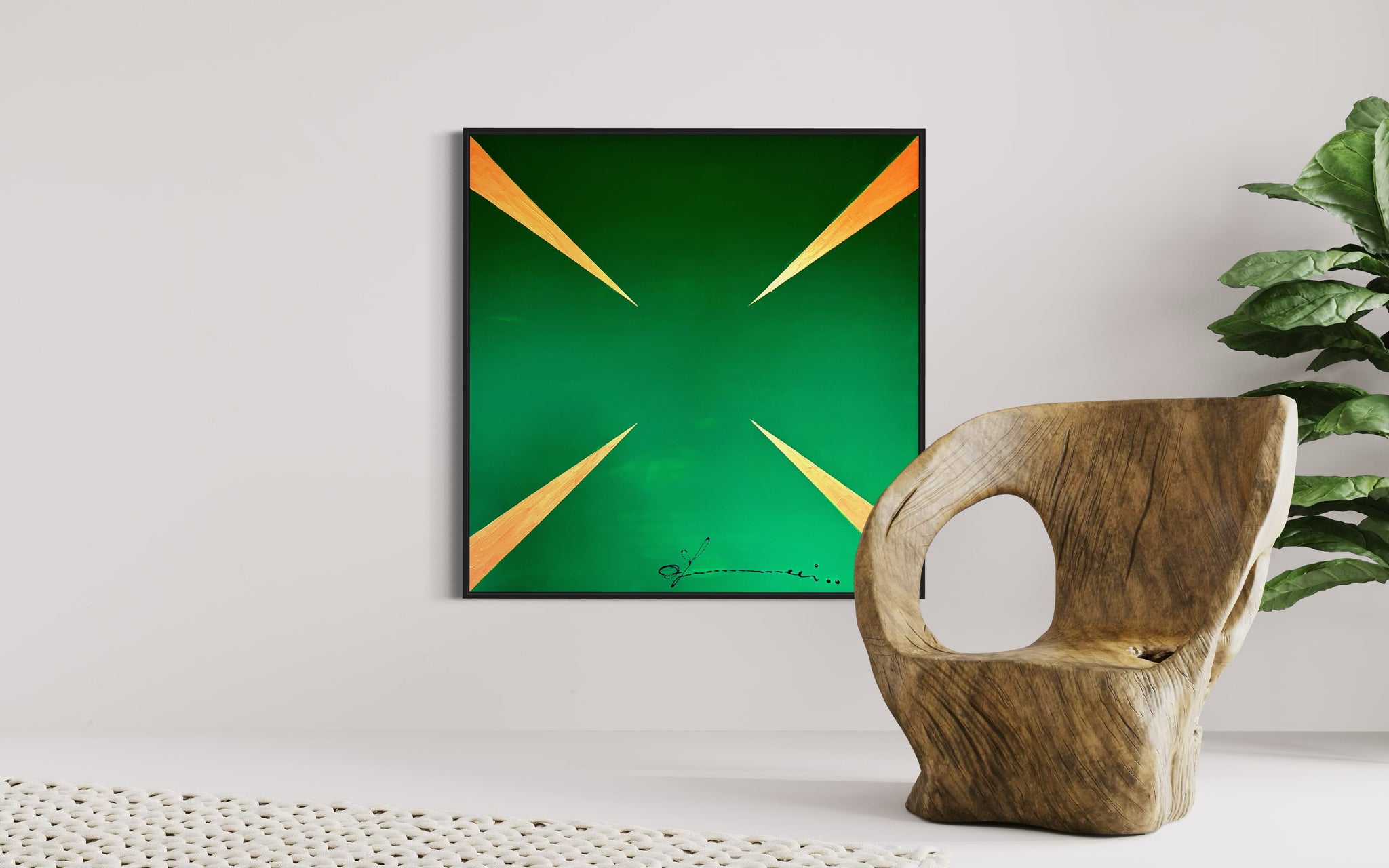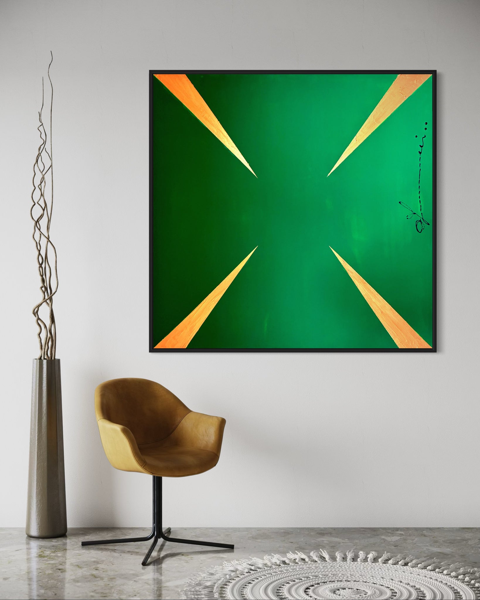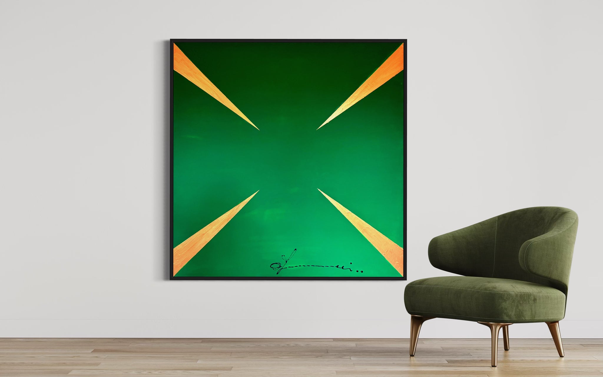 "G Stop" is a striking visual meditation on insatiability. The painting presents a dynamic pattern of sharp, gleaming gold arrows, each one oriented to propel the gaze forward, set against an unbroken background of deep, avaricious green. This composition does more than depict greed; it embodies its very mechanism. The arrows represent the perpetual motion of desire the endless drive to acquire, produce, and consume. There is no terminus, no point of satisfaction in the work; only the relentless suggestion of more. Thus, the painting becomes a powerful symbol of the modern condition, critiquing a cycle where the pursuit of wealth and growth becomes an endless, self perpetuating goal, forever out of reach.
