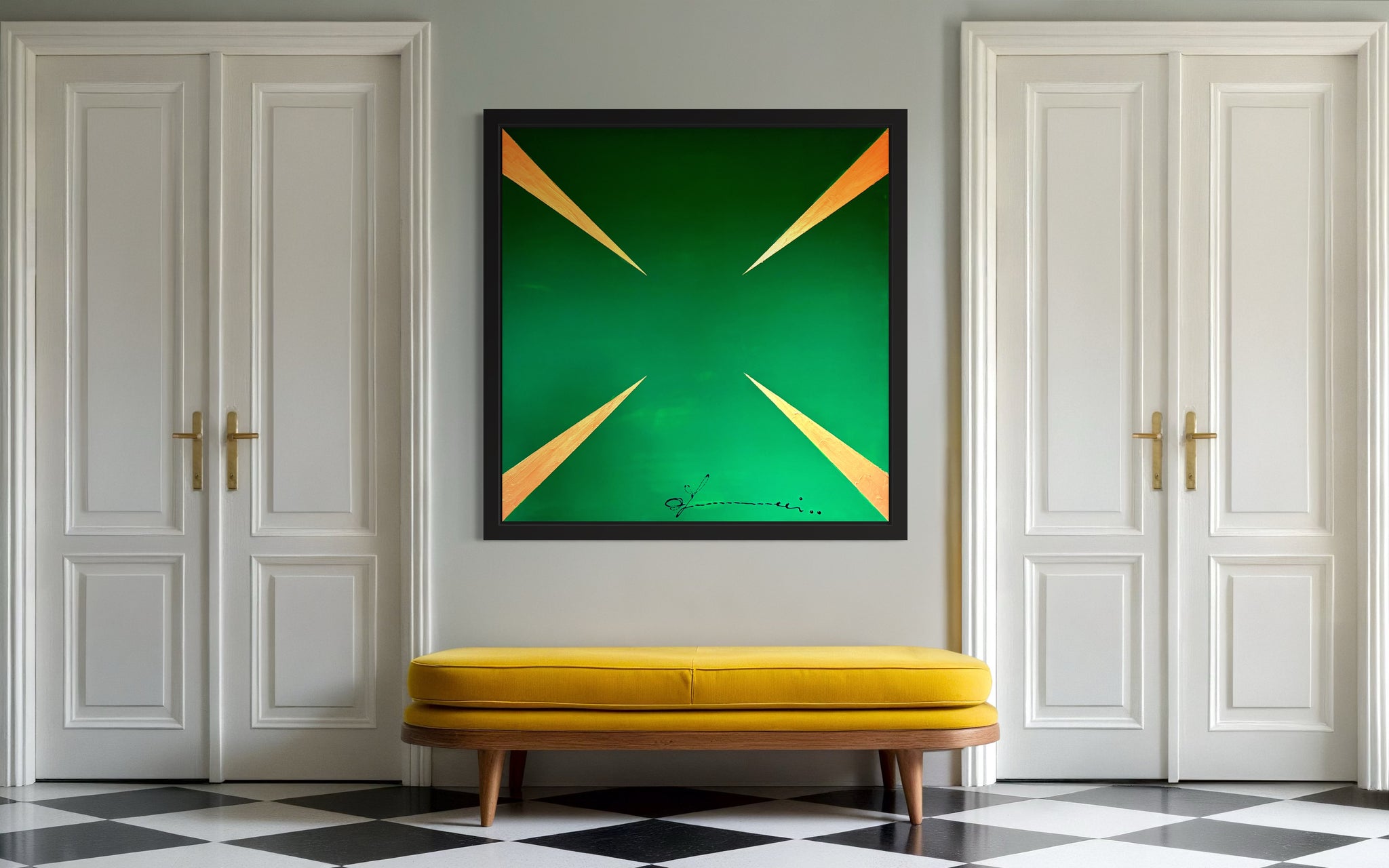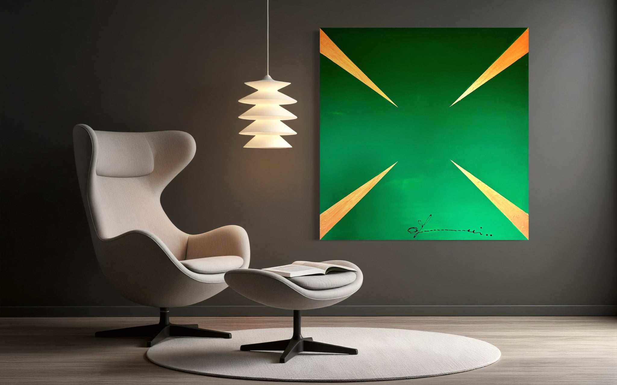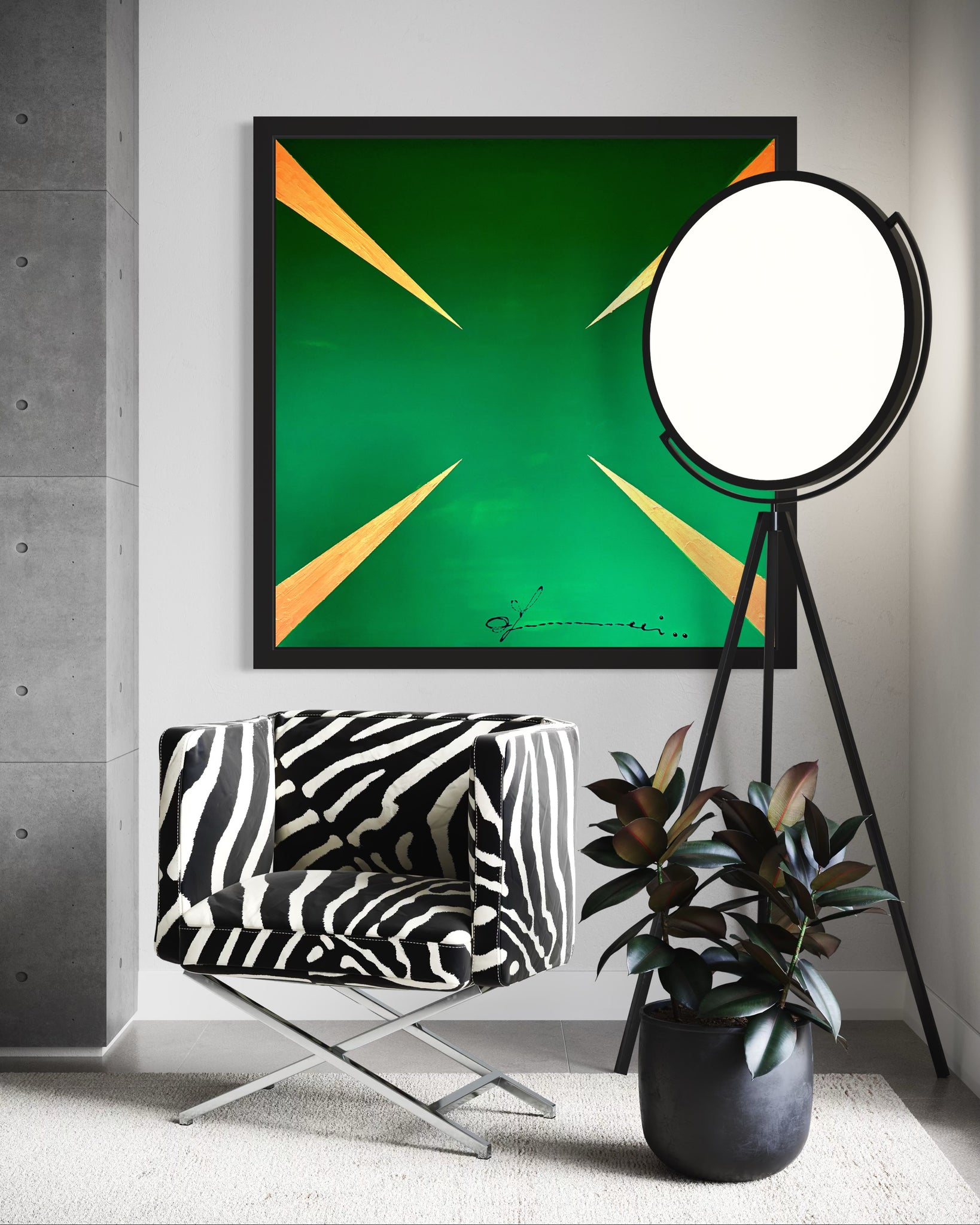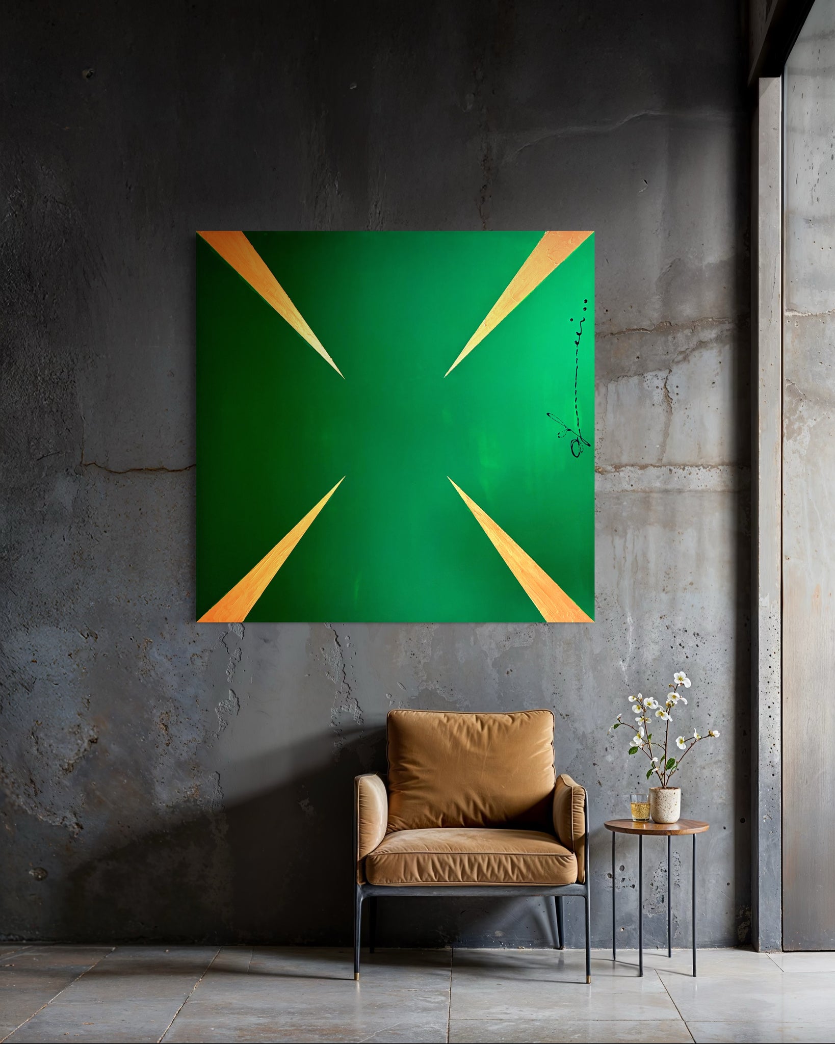 "G Stop" is a striking visual meditation on insatiability. The painting presents a dynamic pattern of sharp, gleaming gold arrows, each one oriented to propel the gaze forward, set against an unbroken background of deep, avaricious green. This composition does more than depict greed; it embodies its very mechanism. The arrows represent the perpetual motion of desire the endless drive to acquire, produce, and consume. There is no terminus, no point of satisfaction in the work; only the relentless suggestion of more. Thus, the painting becomes a powerful symbol of the modern condition, critiquing a cycle where the pursuit of wealth and growth becomes an endless, self perpetuating goal, forever out of reach.