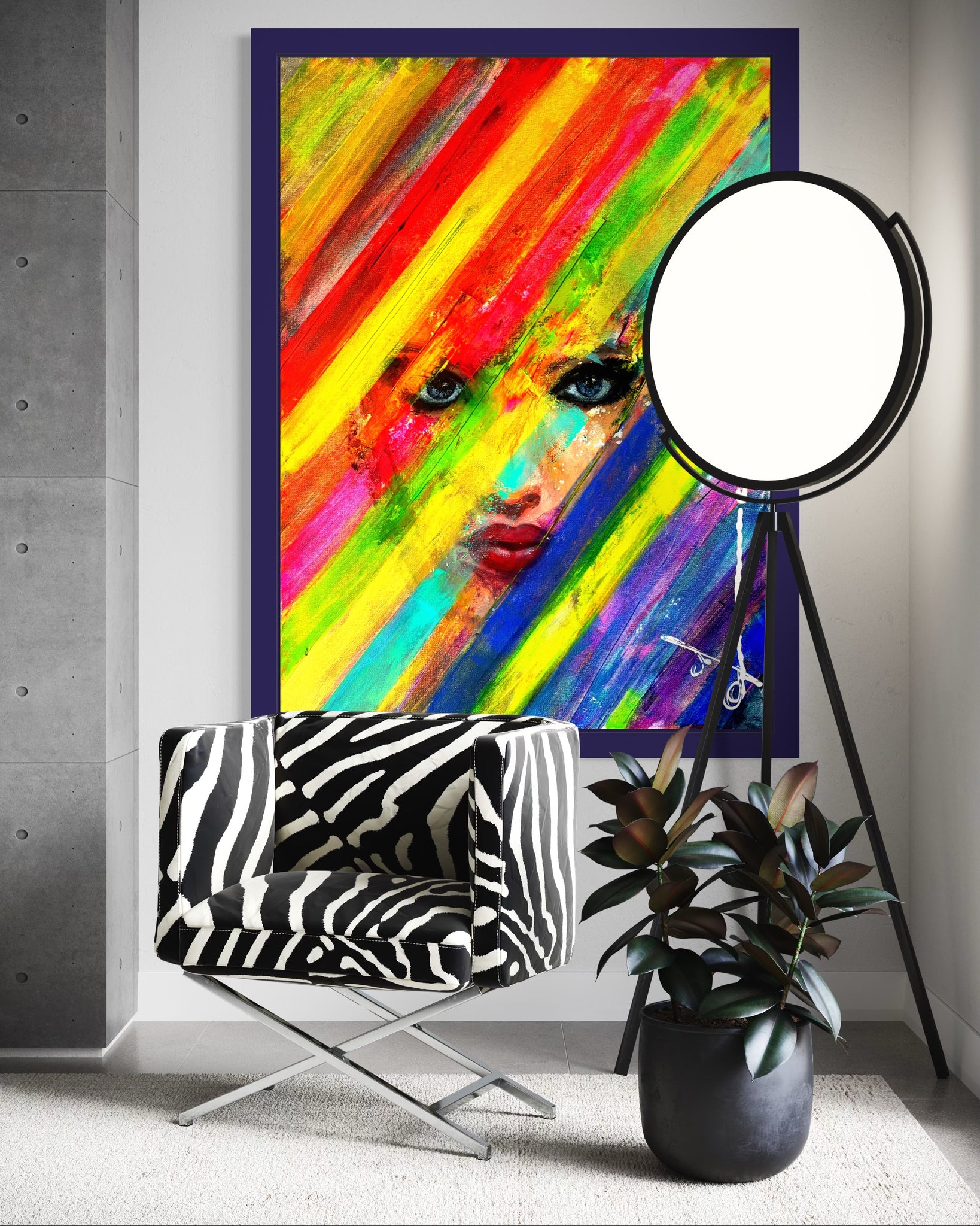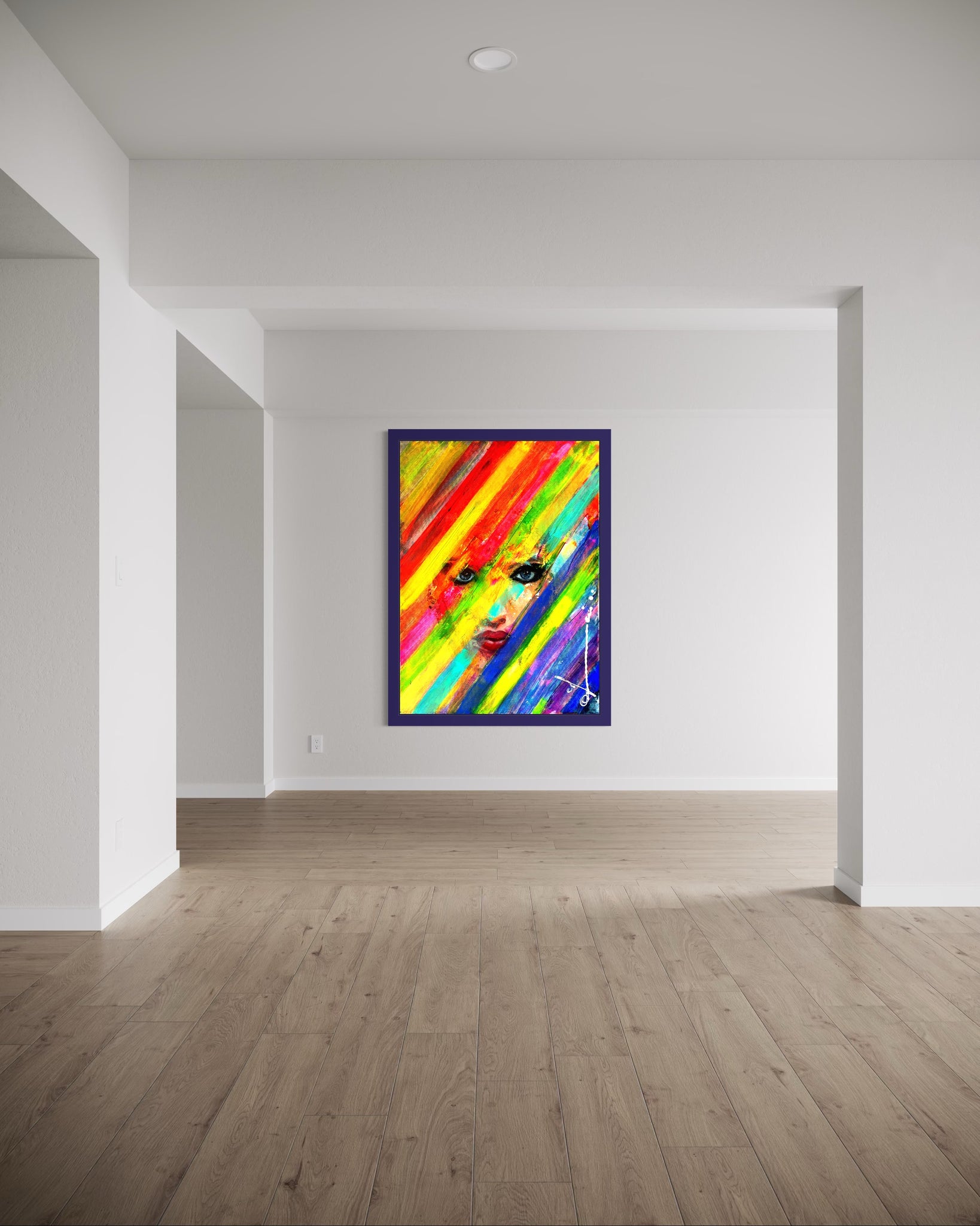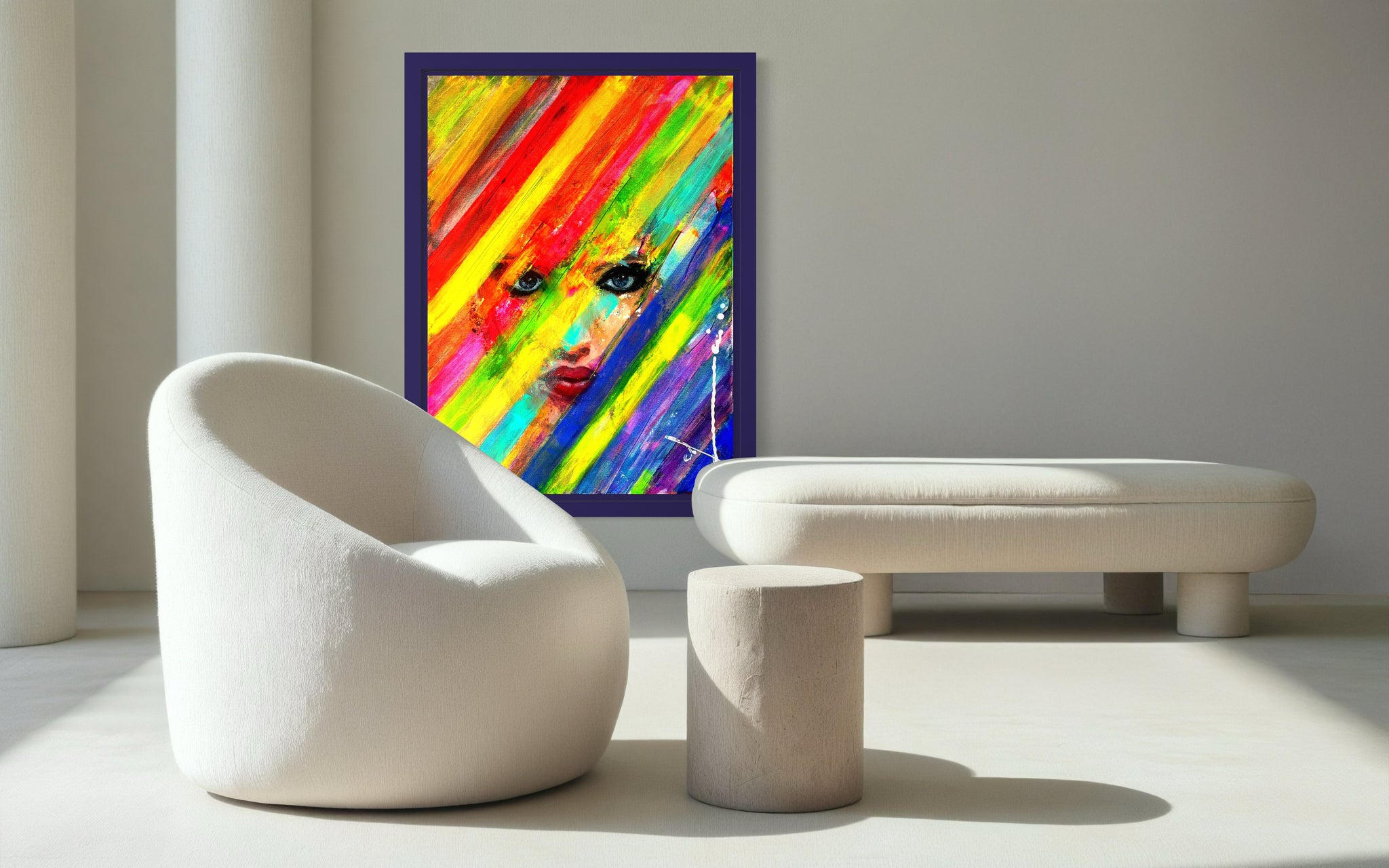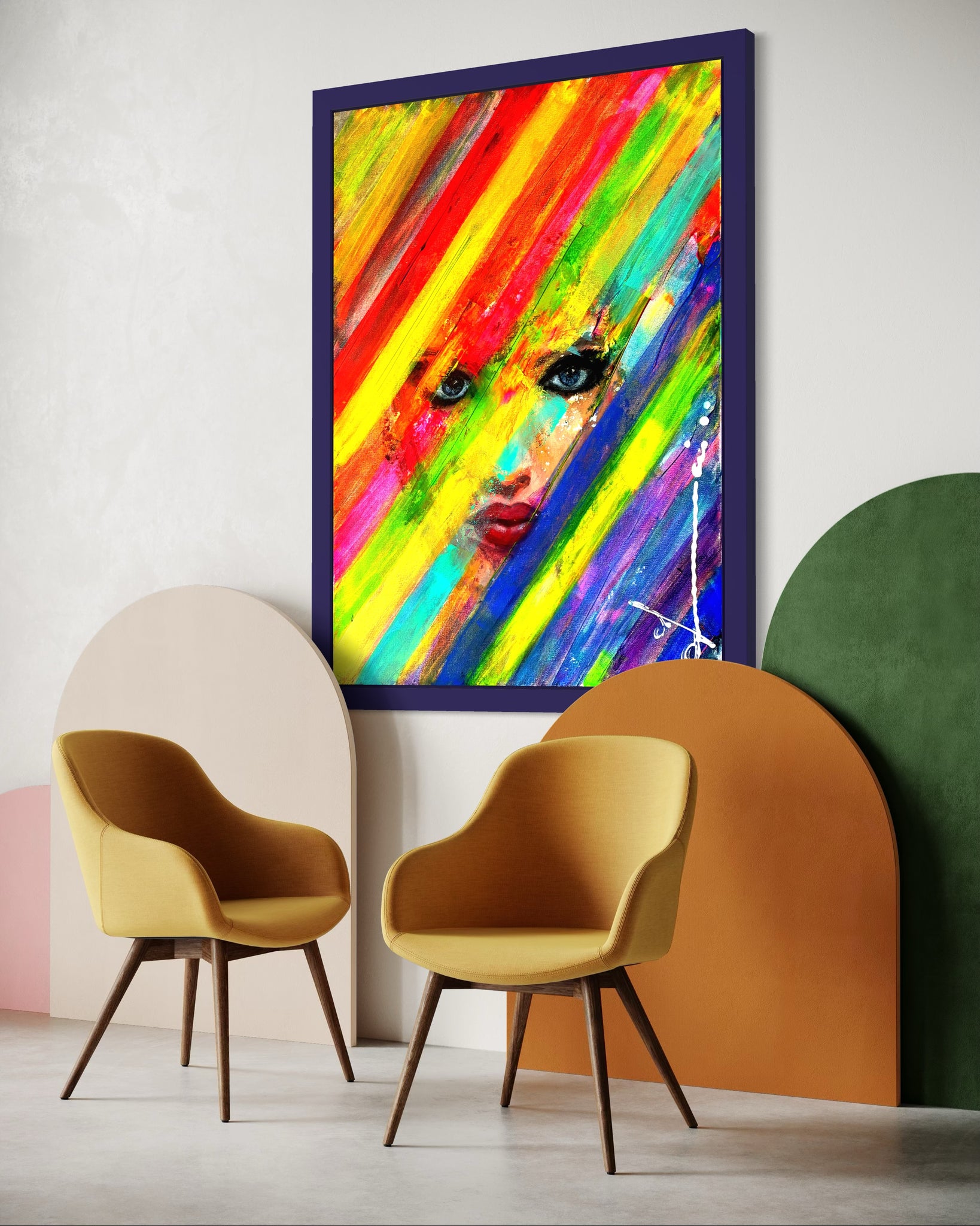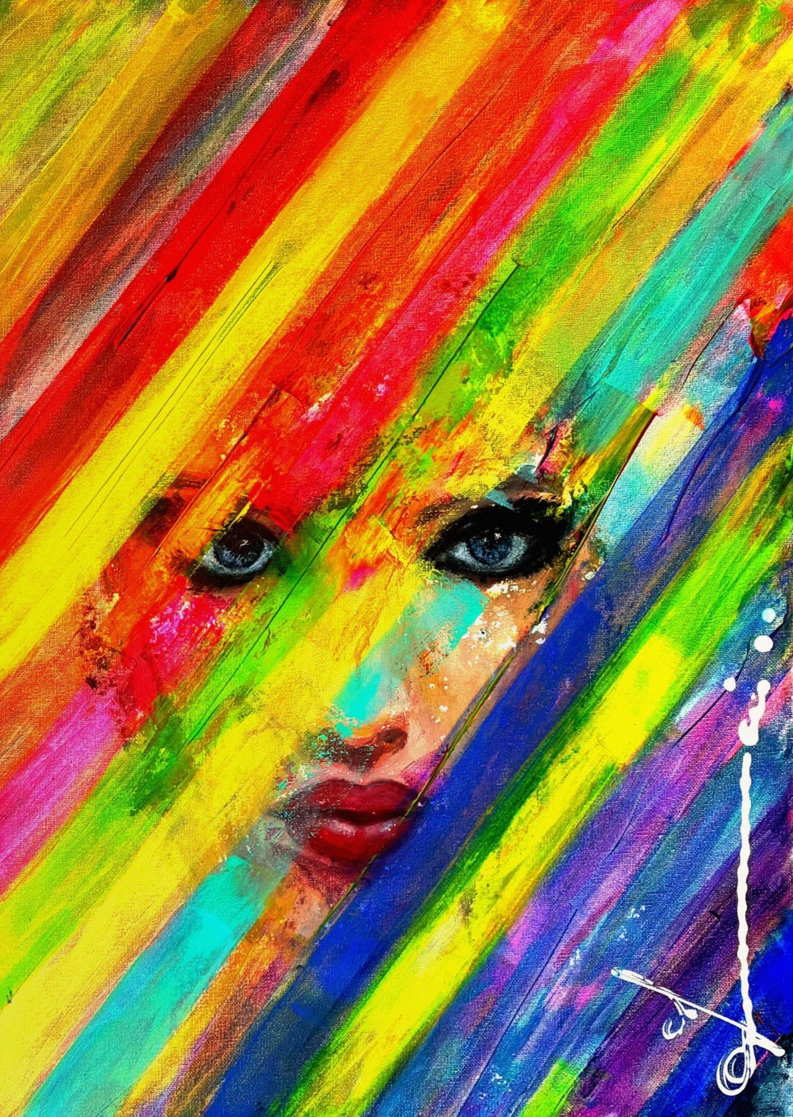 Reveal is a painting dedicated to the courage of oppressed Iranian women. It depicts a woman's defiant eyes and lips behind transversal rainbow stripes, symbolizing a bold vision for freedom."